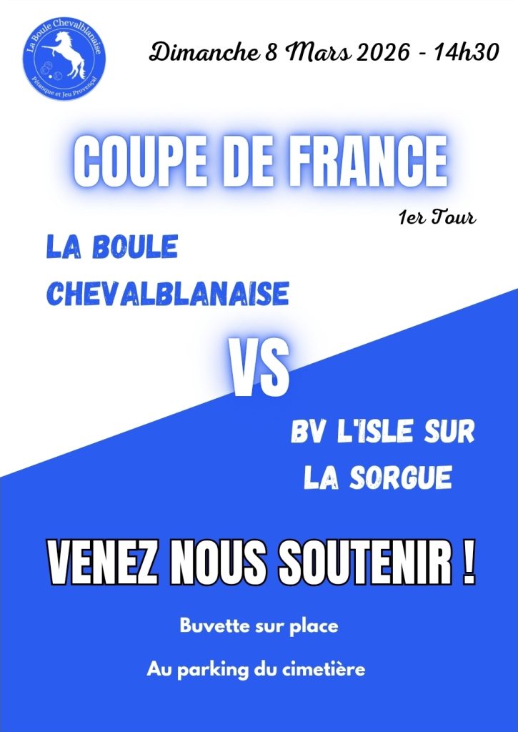 Publié le février 27, 2026février 27, 2026 par Bertrand SergentLa Boule Chevalblanaise et la Coupe de France le 8 mars. Le 8 mars à 14h30 la « Boule Chevalblanaise » accueillera le « BV L’Isle sur la Sorgue » pour le 1° tour de la coupe de France.La rencontre aura lieu au parking du cimetière, il y aura une buvette sur place.Les chevalblanais espèrent votre soutien.Bertrand Sergent.